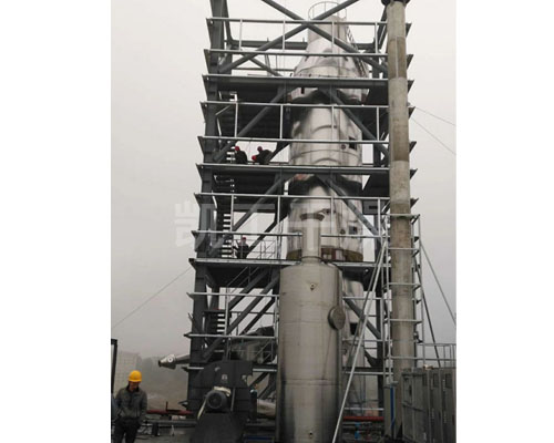 本机组工作过程为料液通过隔膜泵高压输入,喷出雾状液滴,然后同热空气并流下降,大部分粉粒由塔底排料口收集,废气及其微小粉末经旋风分离器分离,废气由抽风机排出,粉末由设在旋风分离器下端的授粉筒收集,风机出口还可装备二级除尘装置,回收率在96-98%以上。