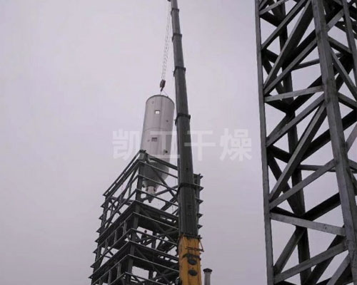 本机组工作过程为料液通过隔膜泵高压输入,喷出雾状液滴,然后同热空气并流下降,大部分粉粒由塔底排料口收集,废气及其微小粉末经旋风分离器分离,废气由抽风机排出,粉末由设在旋风分离器下端的授粉筒收集,风机出口还可装备二级除尘装置,回收率在96-98%以上。